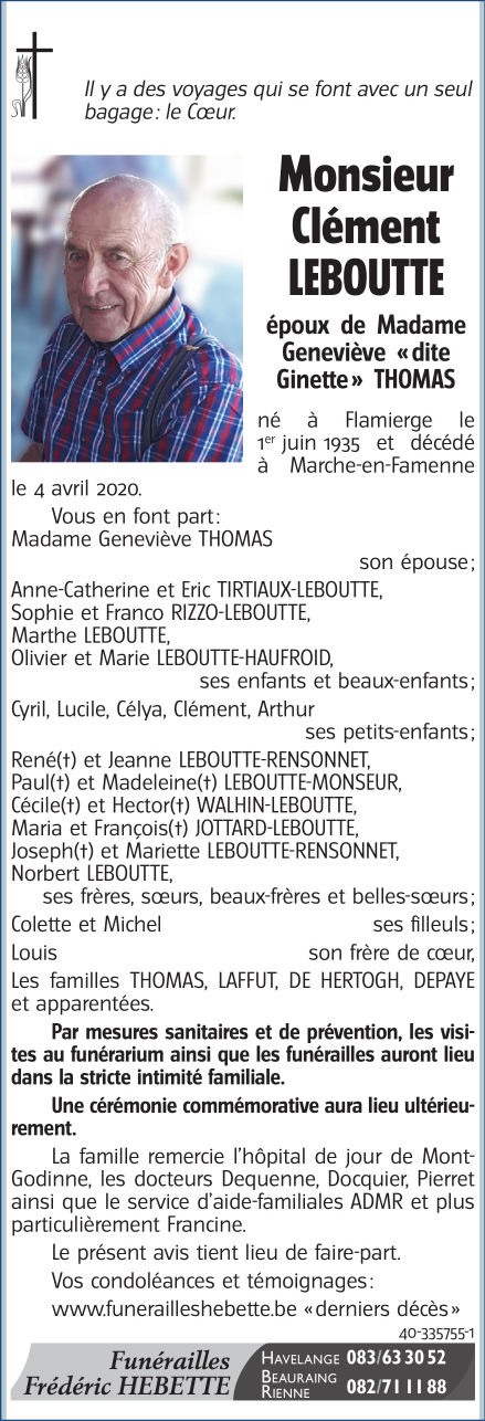 Décédé à Marche-en-Famenne (6900) le samedi 4 avril 2020 à l'âge de 84 ans