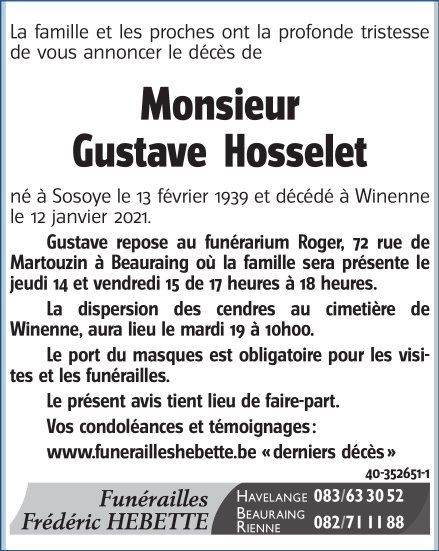 Décédé à Winenne (5570) le mardi 12 janvier 2021 à l'âge de 81 ans