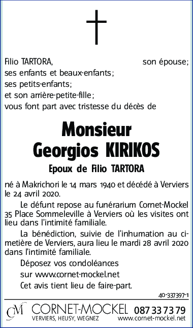 Overleden te Verviers (4800) op vrijdag 24 april 2020 op 80-jarige leeftijd