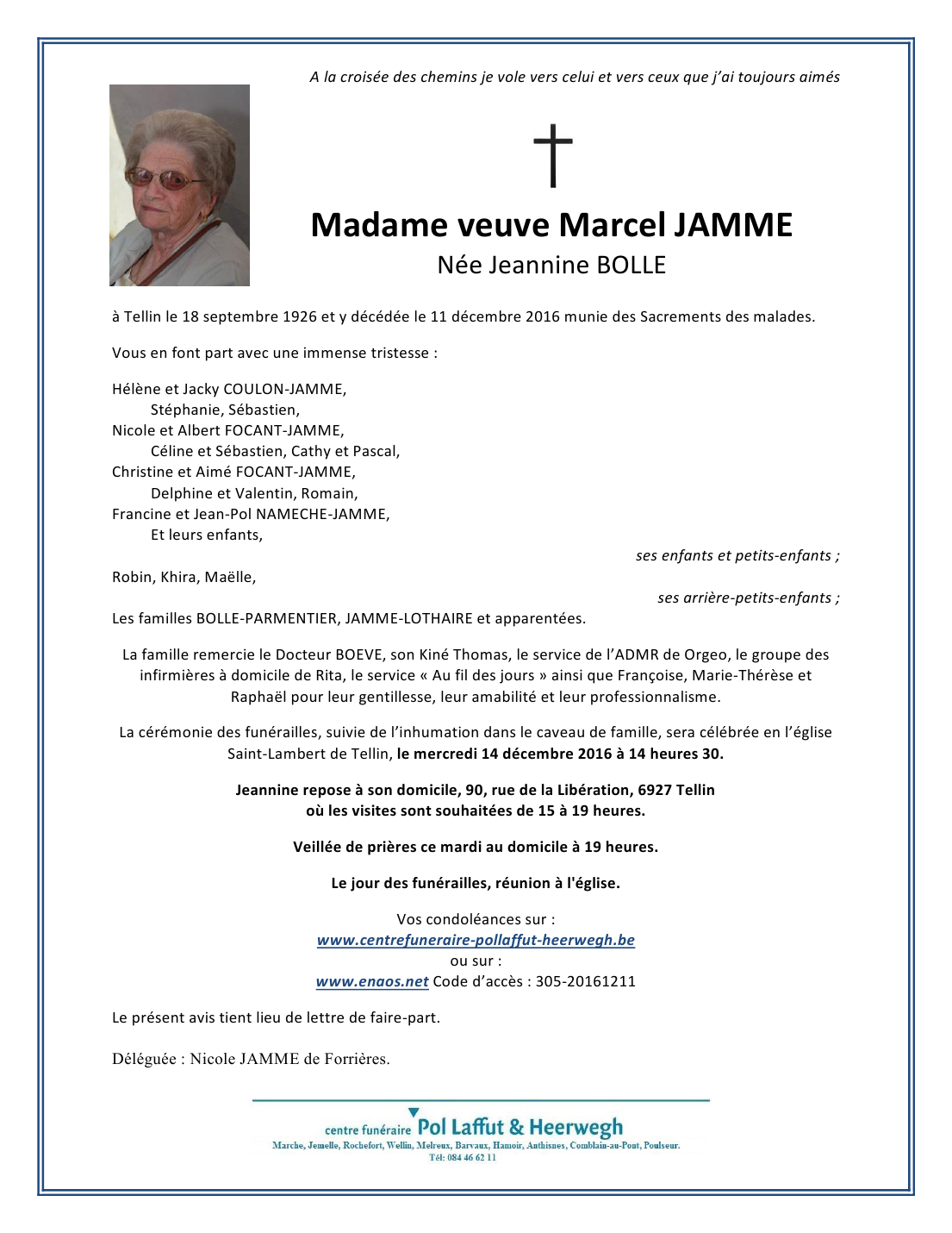 Fallecida en Tellin (6927) el domingo, 11 de diciembre de 2016 a la edad de 90 años