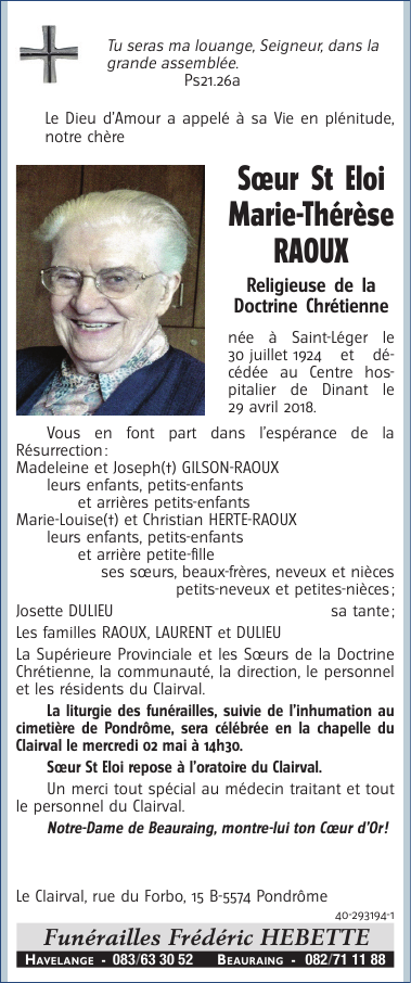 Sœur St Eloi Marie-Thérèse RAOUX