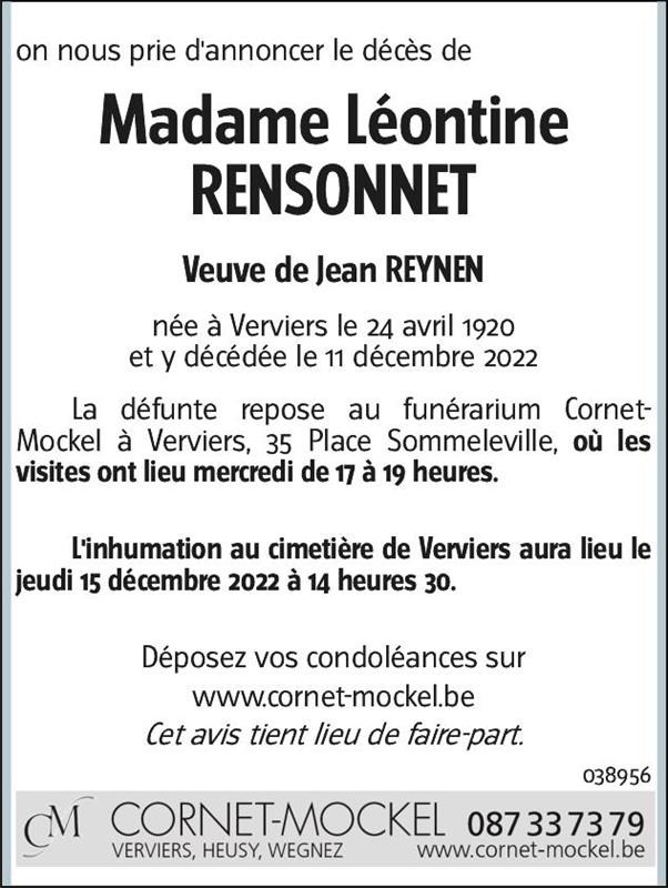 Fallecida en Heusy (4802) el domingo, 11 de diciembre de 2022 a la edad de 102 años