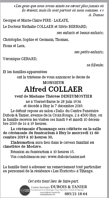 Décédé à Huy (4500) le samedi 7 décembre 2019 à l'âge de 85 ans