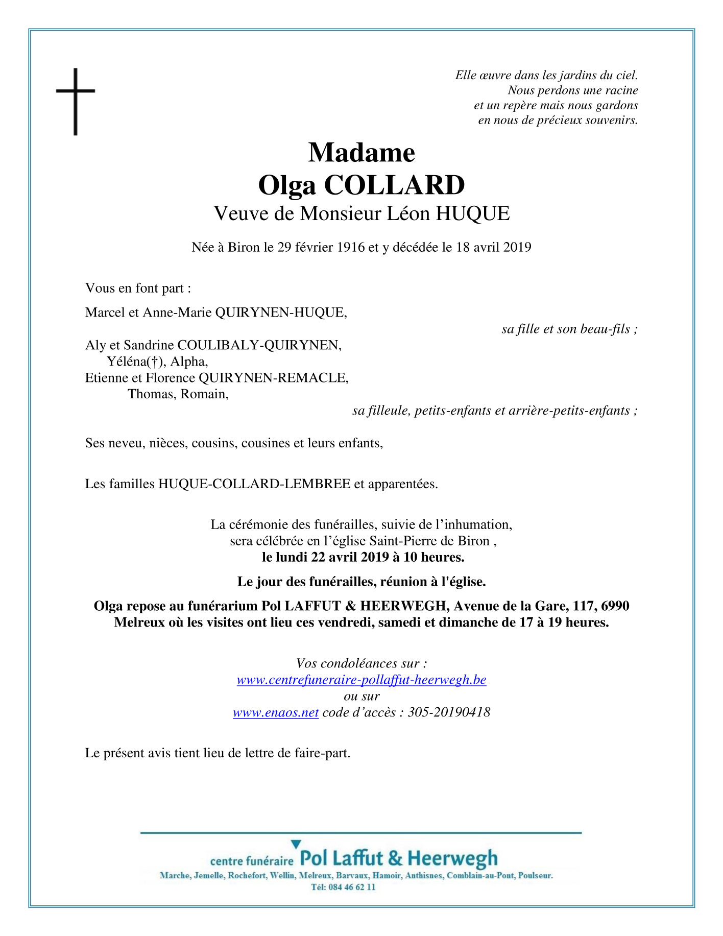 Décédée à Biron (6997) le jeudi 18 avril 2019 à l'âge de 103 ans