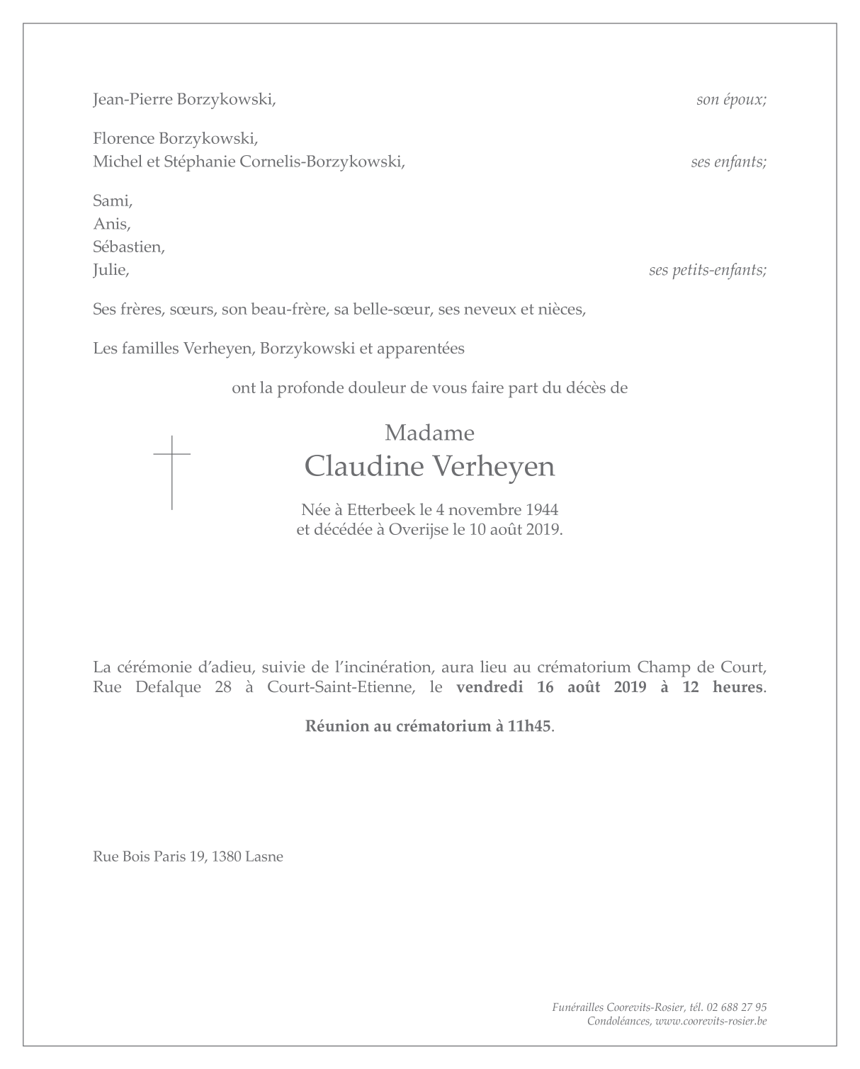 Overleden te Overijse (3090) op zaterdag 10 augustus 2019 op 74-jarige leeftijd