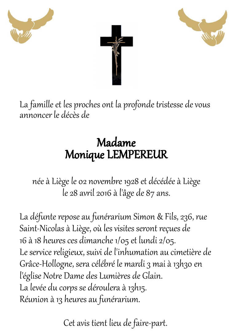 Overleden te Liège (4000) op donderdag 28 april 2016 op 87-jarige leeftijd