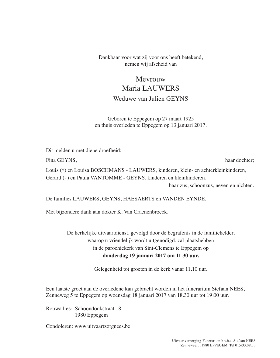 Died in Eppegem (1980) on 13 January 2017 at the age of 91 years