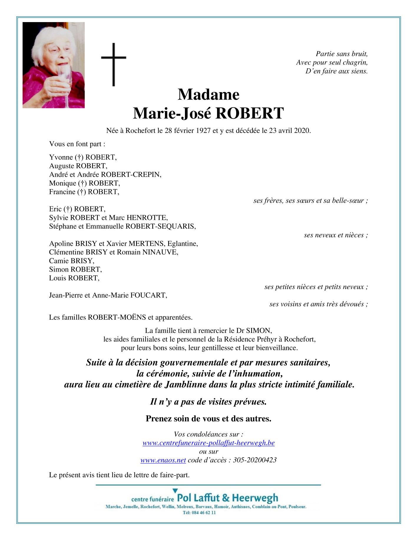 Décédée à Rochefort (5580) le jeudi 23 avril 2020 à l'âge de 93 ans