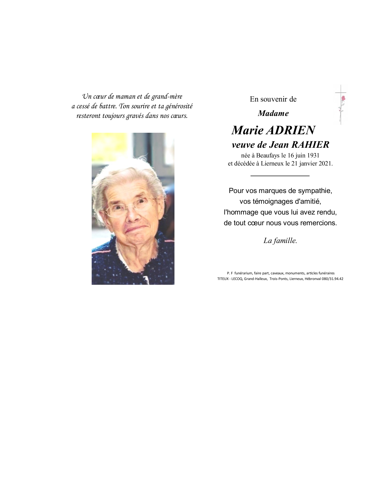 Fallecida en Lierneux (4990) el jueves, 21 de enero de 2021 a la edad de 89 años