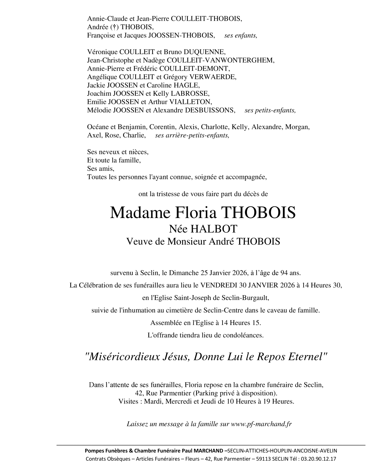 Décédée à Seclin (59113, France) le dimanche 25 janvier 2026 à l'âge de 94 ans