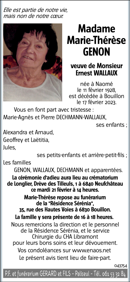 Décédée à Bouillon (6830) le vendredi 17 février 2023 à l'âge de 95 ans