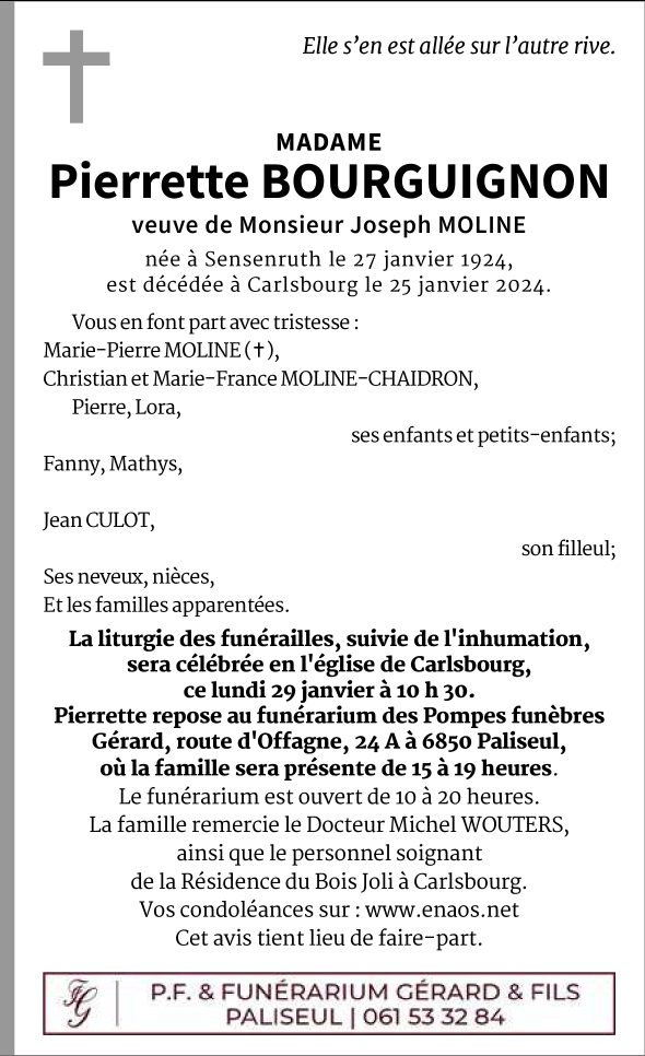 Overleden te Carlsbourg (6850) op vrijdag 26 januari 2024 op 99-jarige leeftijd