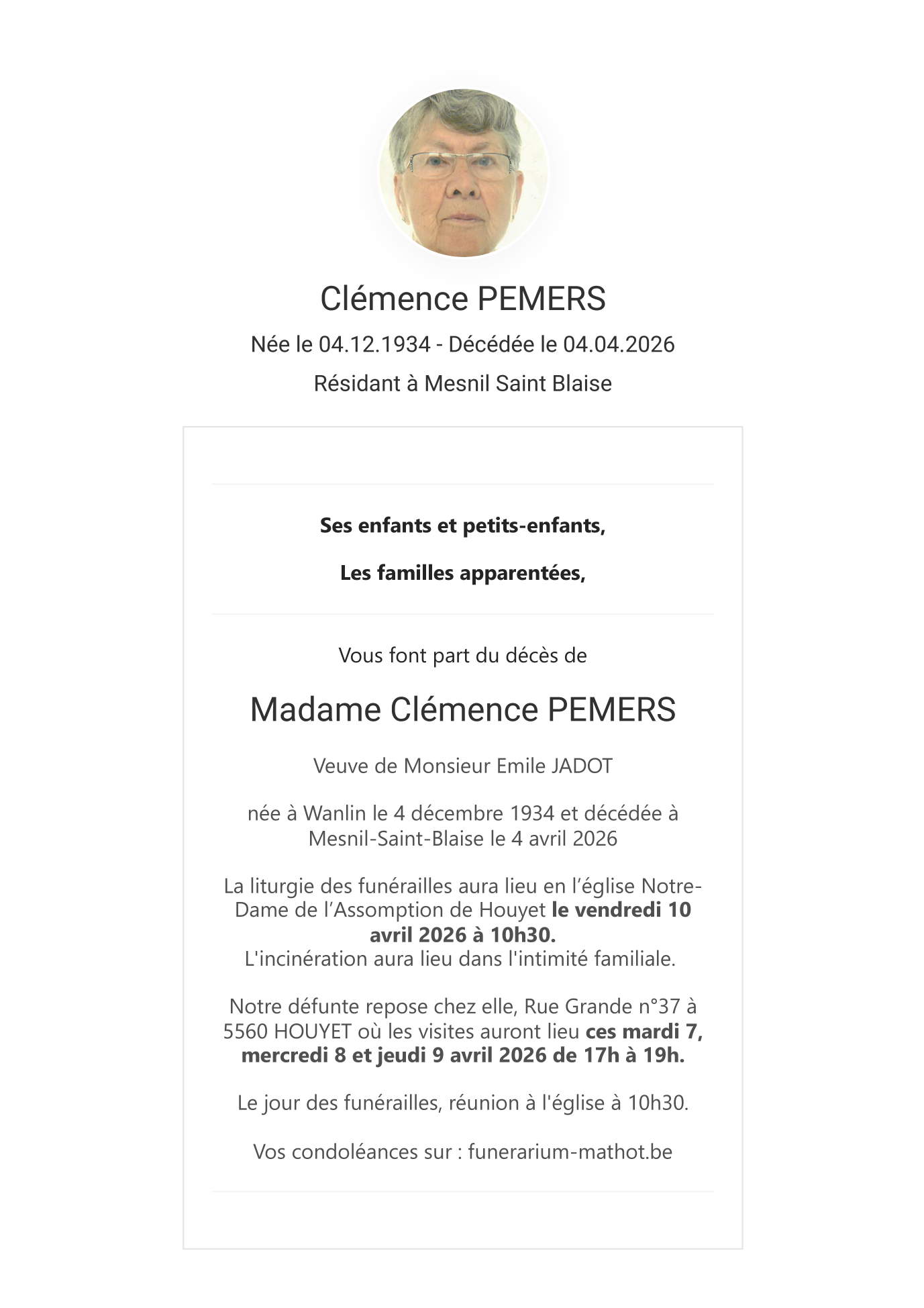 Décédée à Ciney (5590) le samedi 4 avril 2026 à l'âge de 83 ans