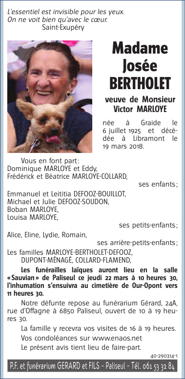 Overleden te Libramont (6800) op maandag 19 maart 2018 op 92-jarige leeftijd