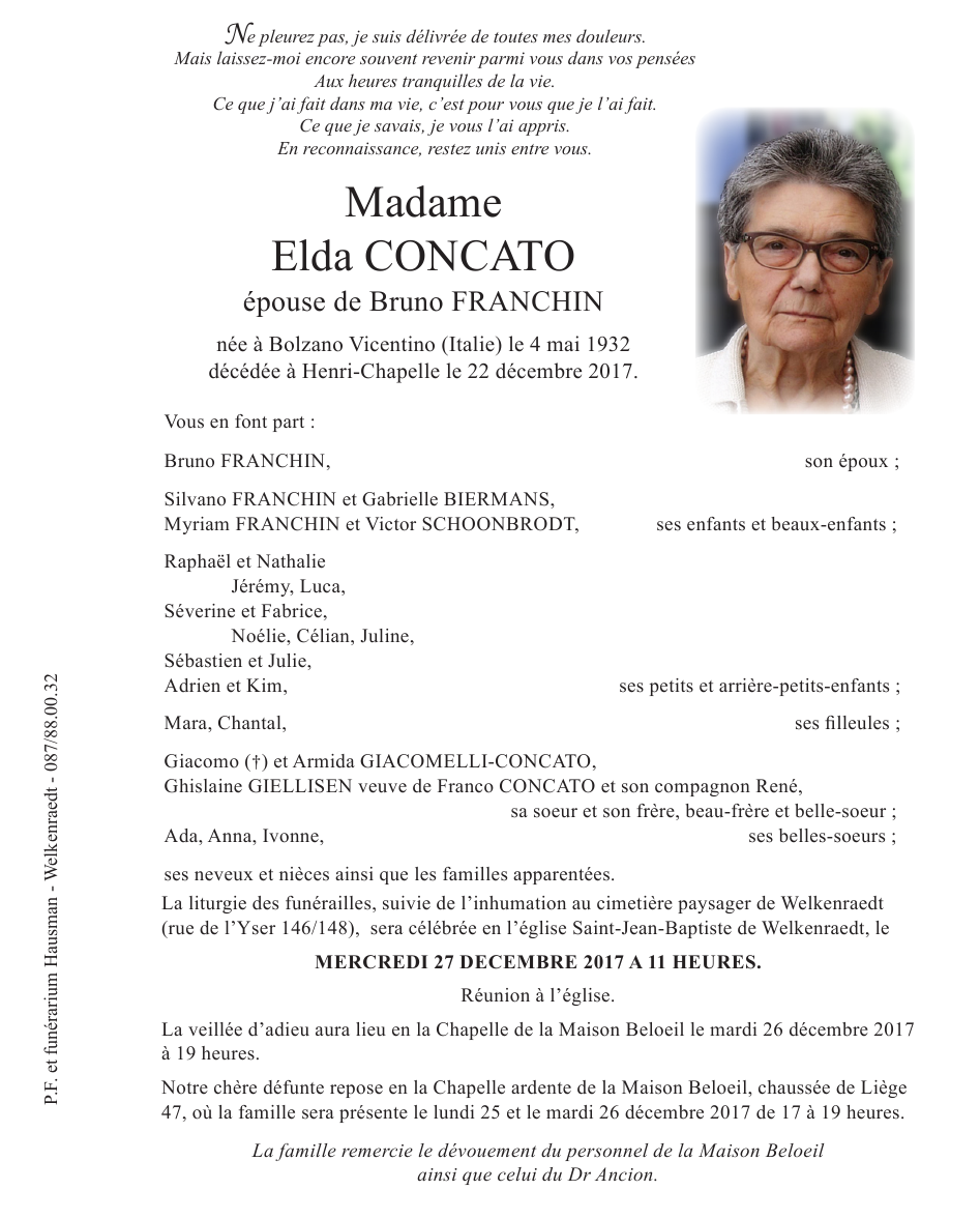 Died in Henri-Chapelle (4841) on 22 December 2017 at the age of 85 years