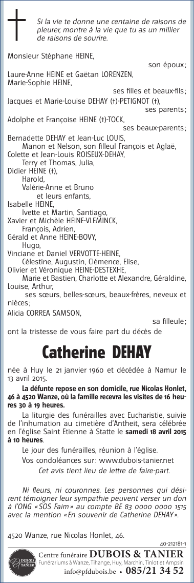 Décédée à Namur (5000) le lundi 13 avril 2015 à l'âge de 55 ans