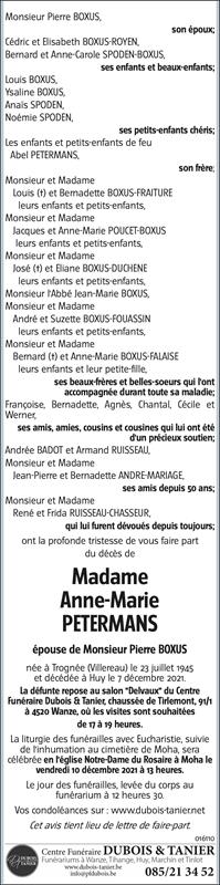 Décédée à Huy (4500) le mardi 7 décembre 2021 à l'âge de 76 ans