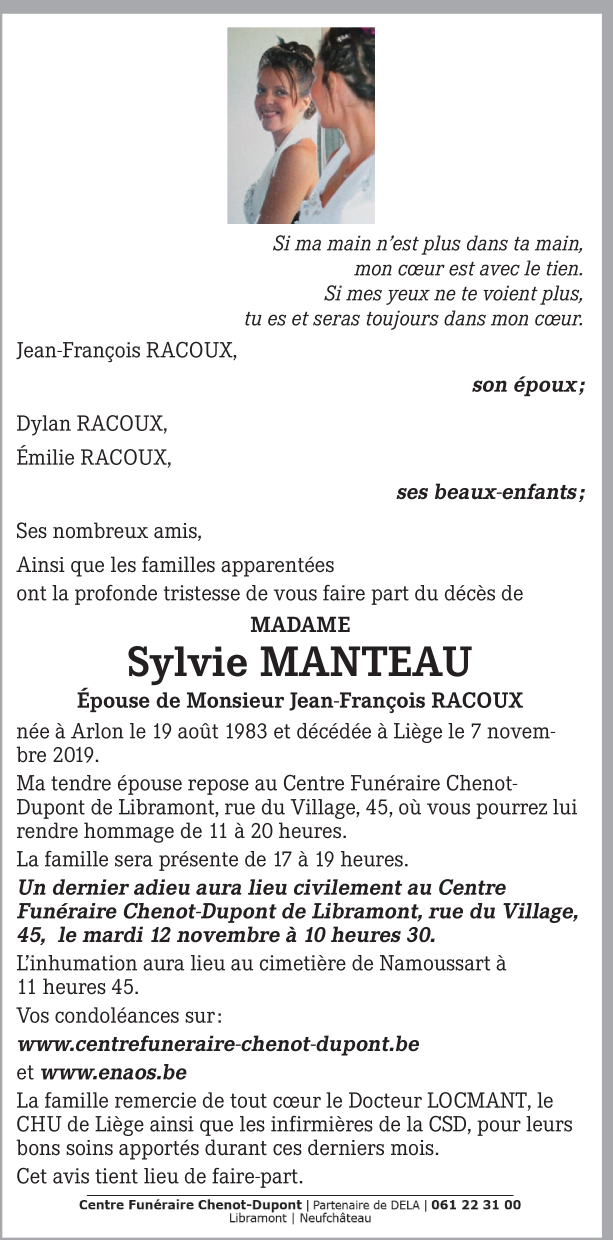 Décédée à Liège (4000) le jeudi 7 novembre 2019 à l'âge de 36 ans