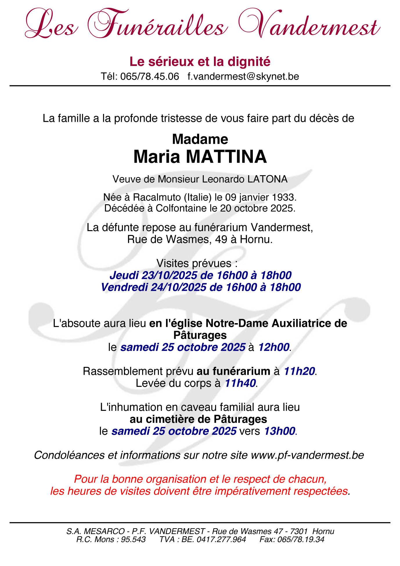Décédée à Colfontaine (7340) le lundi 20 octobre 2025 à l'âge de 92 ans