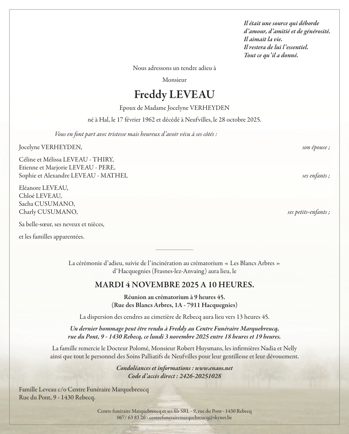 Fallecido en Neufvilles (7063) el martes, 28 de octubre de 2025 a la edad de 63 años
