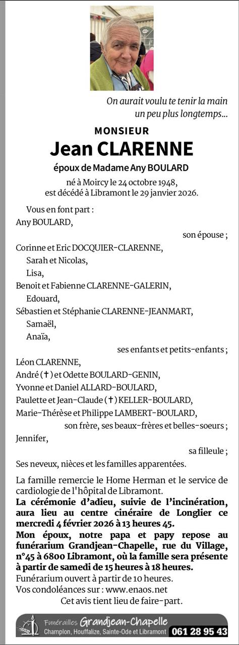 Décédé à Libramont (6800) le jeudi 29 janvier 2026 à l'âge de 77 ans