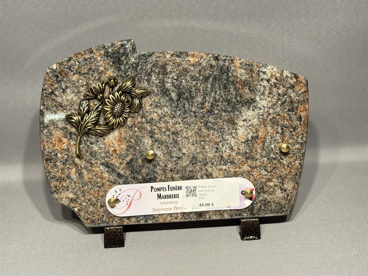 Plaque granit avec bronze fleur, le fond de la plaque est en granit, aux nuances riches de gris et de beige. Matière: Plaque en granit aux couleurs naturelles de gris et beige, avec des nuances noires et dorées./ Dimensions: Longueur 19 cm / Hauteur 15 cm