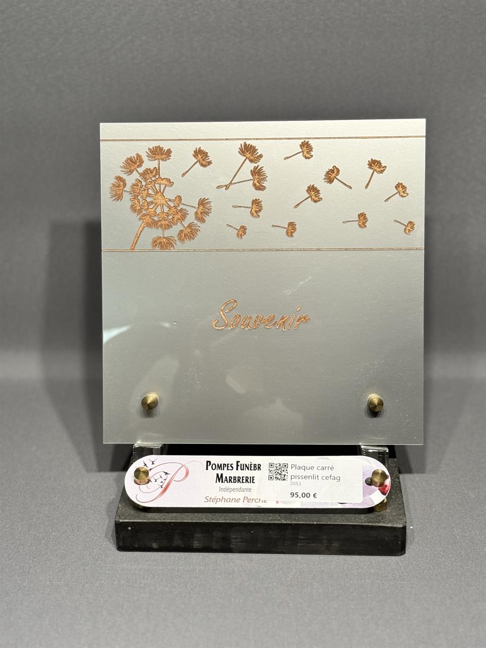 Plaque carrée grise, montée sur un socle en granit noir. Elle est décorée d’un motif de pissenlit dont les aigrettes s’envolent au vent. Longueur : 18 cm Hauteur : 18 cm