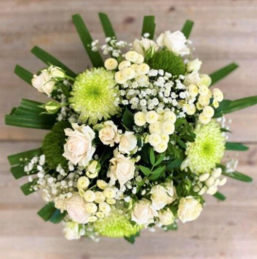 Bouquet rond de fleurs de saison dans les tons de blanc et vert, avec bulle d'au - Diamètre 30 cm