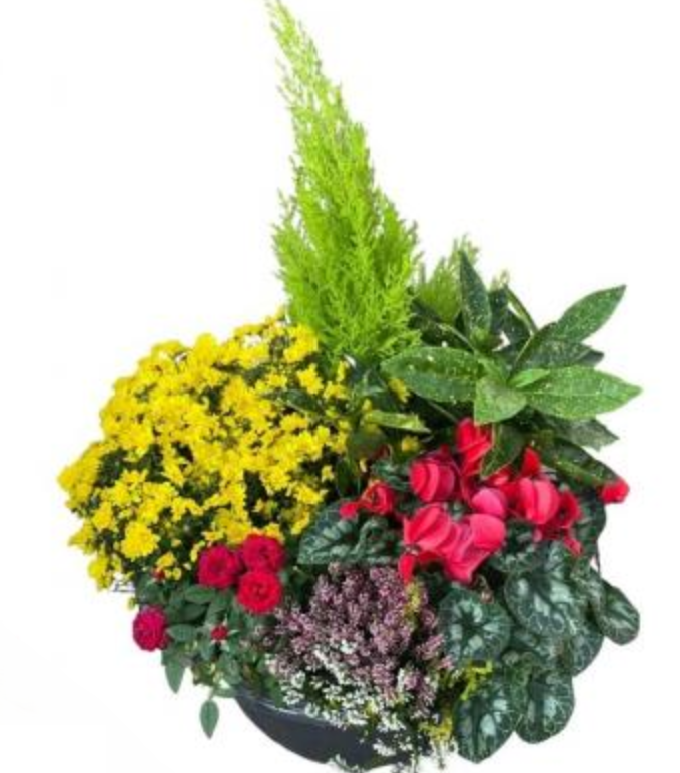 Composition avec plantes et fleurs de saison - Diamètre env. 40 cm - Convient pour les cimetières