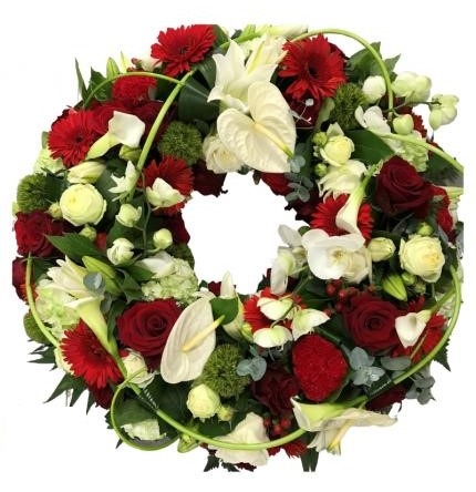 Elégante couronne de fleurs de saison dans les tons de blanc et de rouge avec généreux feuillage - Env. 60 cm - Ruban inclus avec 50 caractères max -