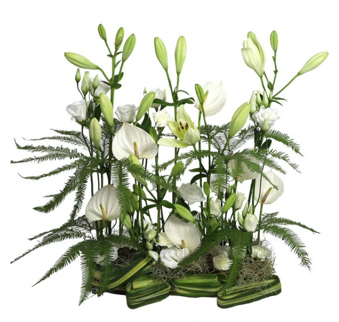 Devant de tombe graphique blanc et agrémenté d'un généreux feuillage - Env. 60 cm - Ruban inclus avec 50 caractères max -