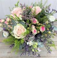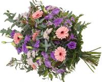 Gerbe pastel de style champêtre à base de fleurs saison dans les tons de rose et parme sur lit de feuillage - Env. 60 / 65 cm