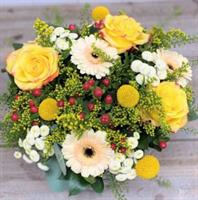 Eclatant bouquet rond de fleurs de saison colorées, avec bulle d'au - Diamètre 30 cm