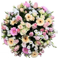 Délicat coussin conique de fleurs de saison pastel avec abondan feuillage - D 40 x H 50 cm env. - Ruban inclus avec 50 caractères max -