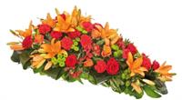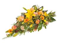 Eclatant dessus de cercueil avec fleurs de saison colorées - Env. 150 cm - Ruban inclus avec 50 caractères max -