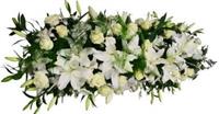 Dessus de cercueil avec fleurs de saison dans les tons blancs et agrémentée d'un généreux feuillage - Env. 150 cm - Ruban inclus avec 50 caractères max -