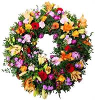 Eclatante raquette de fleurs de saison colorées - Env. 70 / 75 cm - Ruban inclus avec 50 caractères max -