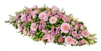 Délicat dessus de cercueil avec fleurs de saison pastel - Env. 150 cm - Ruban inclus avec 50 caractères max -