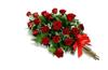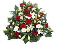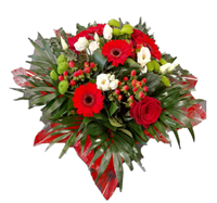 | AMITIE Gerbe piquée composée de roses rouges et de feuillages.