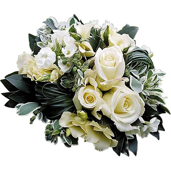 Gerbe piquée blanche avec feuillage et fleurs de saison - Longueur env. 80 cm -