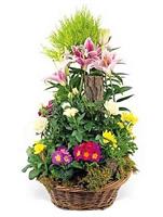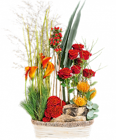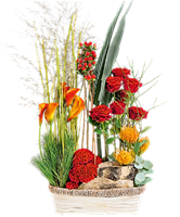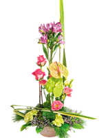 Composition haute colorée avec feuillage fleurs de saison - Hauteur env. 70 cm -