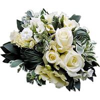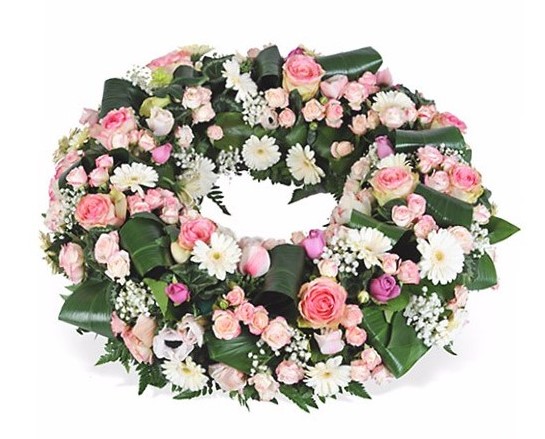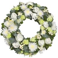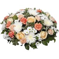 Couronne blanche à plat de fleurs de saison avec feuillage - Diamètre env. 50 cm -