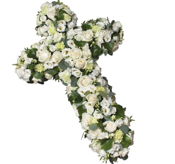 Croix blanche de fleurs de saison avec feuillage - Longueur 70 cm -
