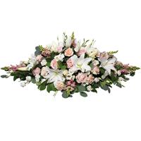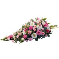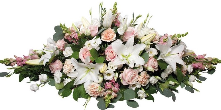 Dessus de cercueil pastel avec feuillage et fleurs de saison - Longueur env. 100 cm -