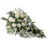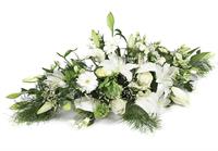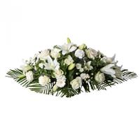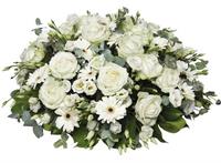 Dessus de cercueil blanc avec feuillage et fleurs de saison - Longueur env. 100 cm -