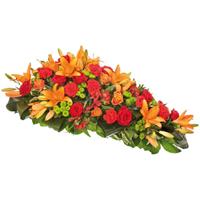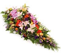 Dessus de cercueil coloré avec feuillage et fleurs de saison - Longueur env. 100 cm -