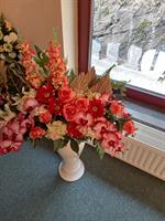 Vasque de fleurs artificielles avec carte de condoléance