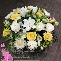 niet-contractuele foto | 🌸Coussin Funéraire "Éclat Solaire" Le coussin "Éclat Solaire" mêle fleurs blanches et jaunes pour évoquer chaleur, souvenirs et espoir.