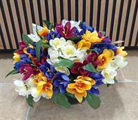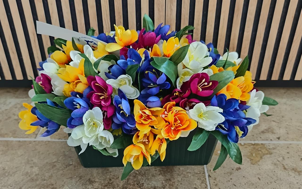 Jardinière lestée de fleurs tergal (crocus multicolores) de 35 de long x 22 cm de haut