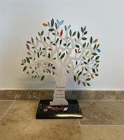 Arbre en aluminium laqué sur socle en granit noir , 43 x 50 cm de haut Ce modèle peut être tout blanc ou les feuilles toutes vertes, texte au choix y compris sur les branches. Le prix ne variera pas. Garantie 25 ans